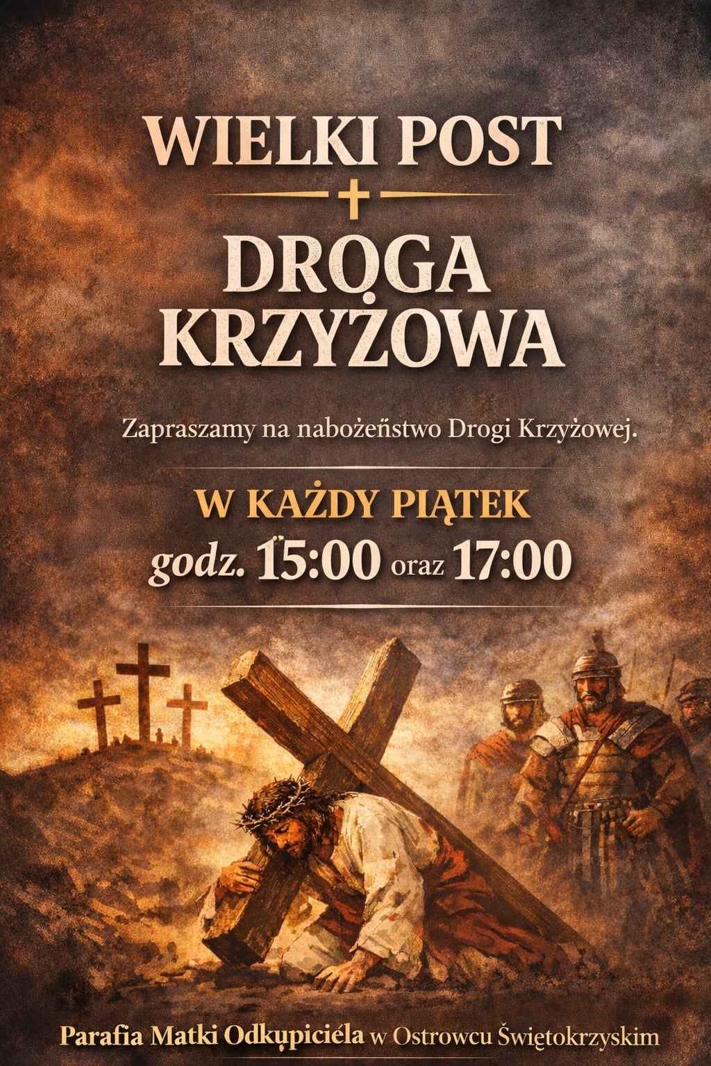 - Droga Krzyżowa w naszym kościele w piątki o godz. 15.00 oraz o godz. 17.00. Gorzkie Żale w niedzielę o godz. 17.00, a po nich, około godz. 17.45, Msza święta. Zachęcam do udziału.