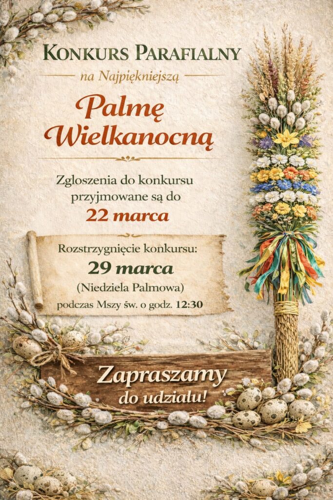 - Dzieci i młodzież zapraszamy do udziału w parafialnym konkursie na najpiękniejszą palmę wielkanocną. Zgłoszenia oraz wykonane palmy można składać do 22 marca. Uroczyste ogłoszenie wyników i wręczenie nagród odbędzie się w Niedzielę Palmową, 29 marca, podczas Mszy Świętej o godz. 12.30.