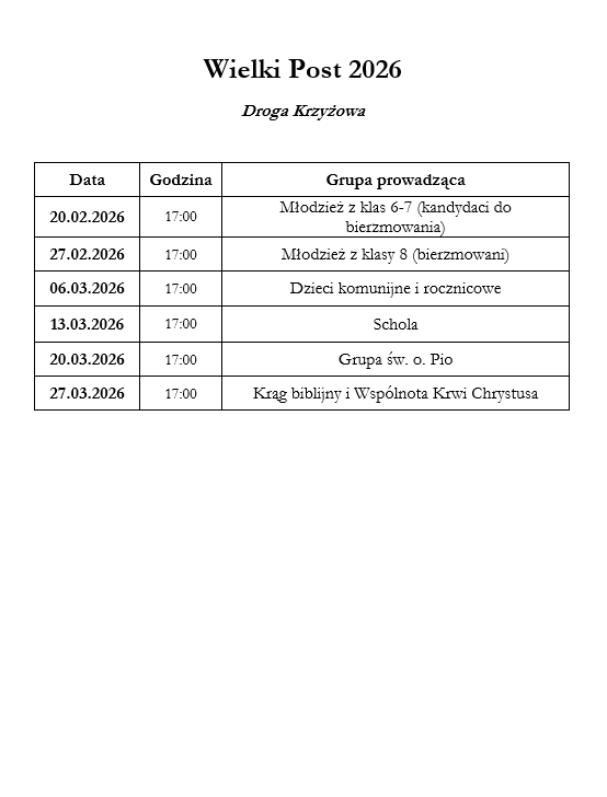- W najbliższy piątek, nabożeństwo Drogi Krzyżowej o godz. 17.00 poprowadzi młodzież z klas 8-ych, przygotowująca się do sakramentu bierzmowania